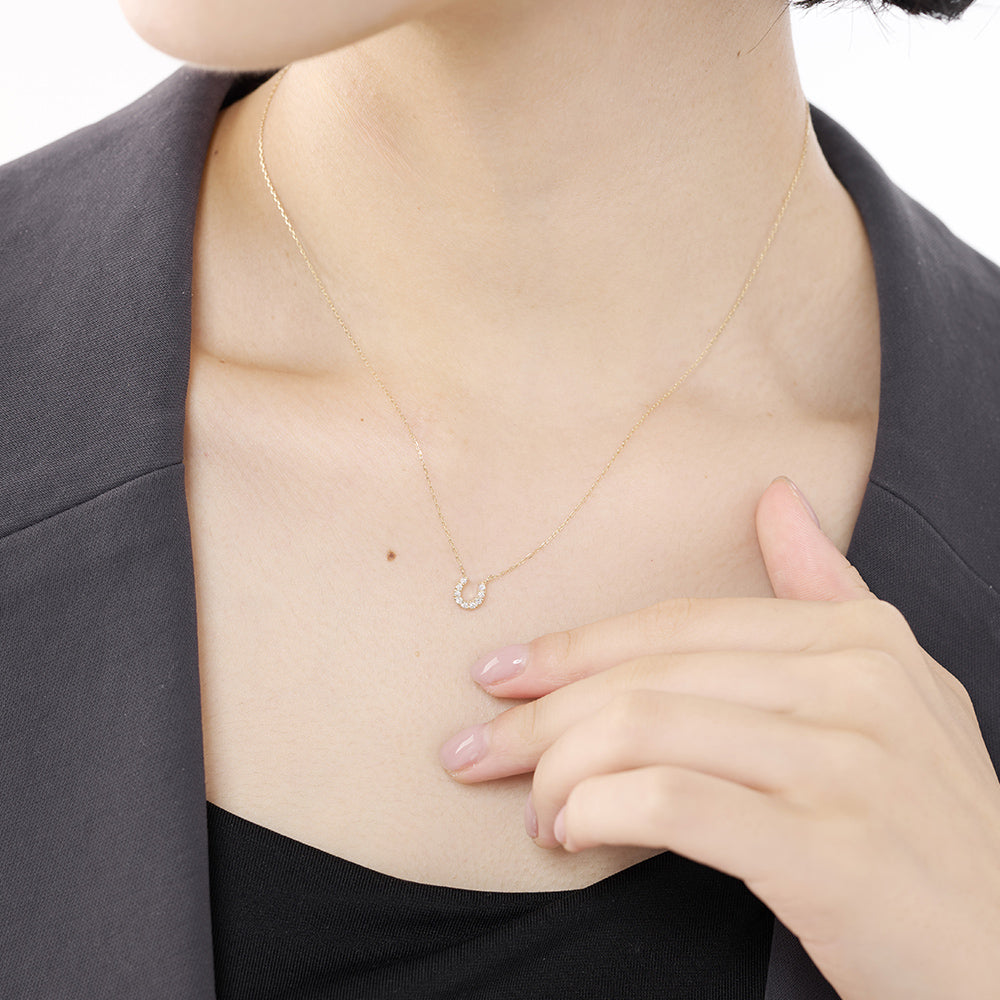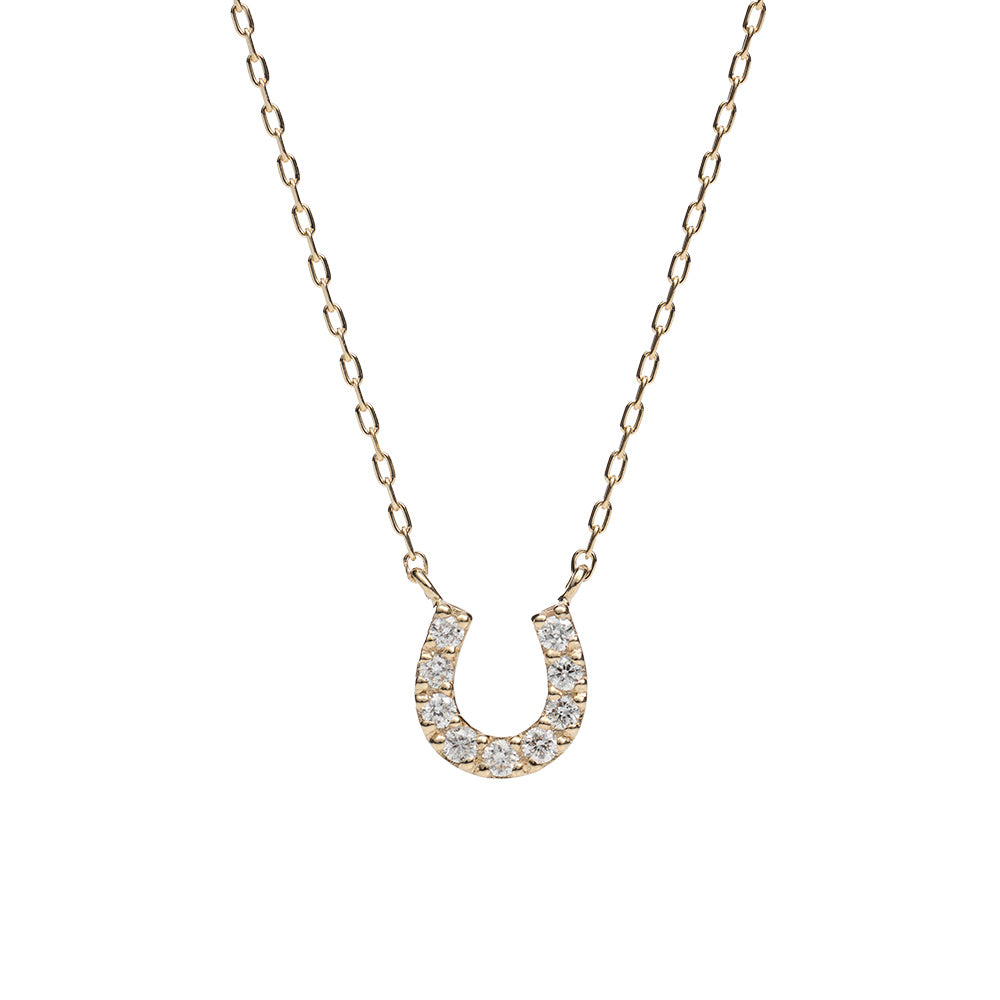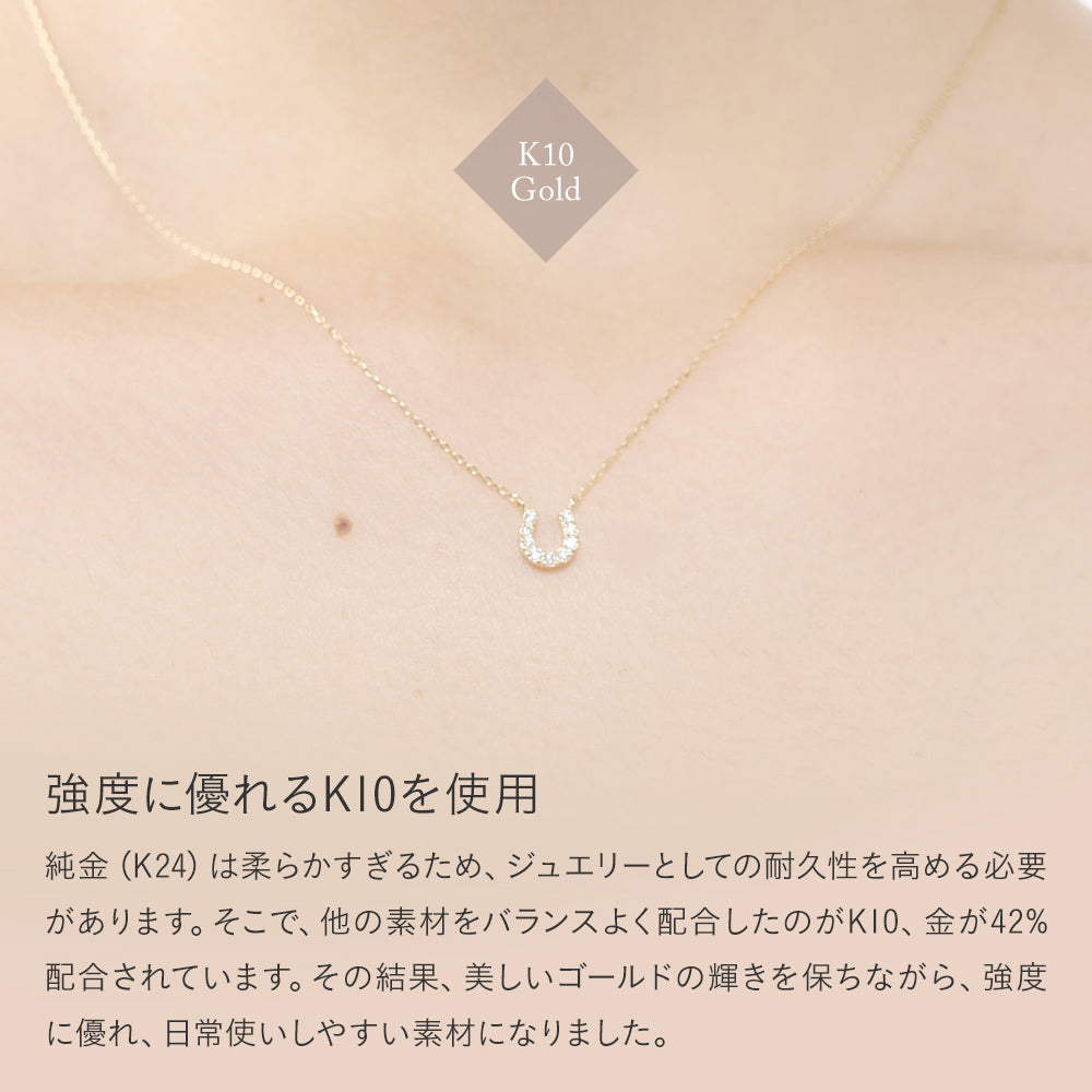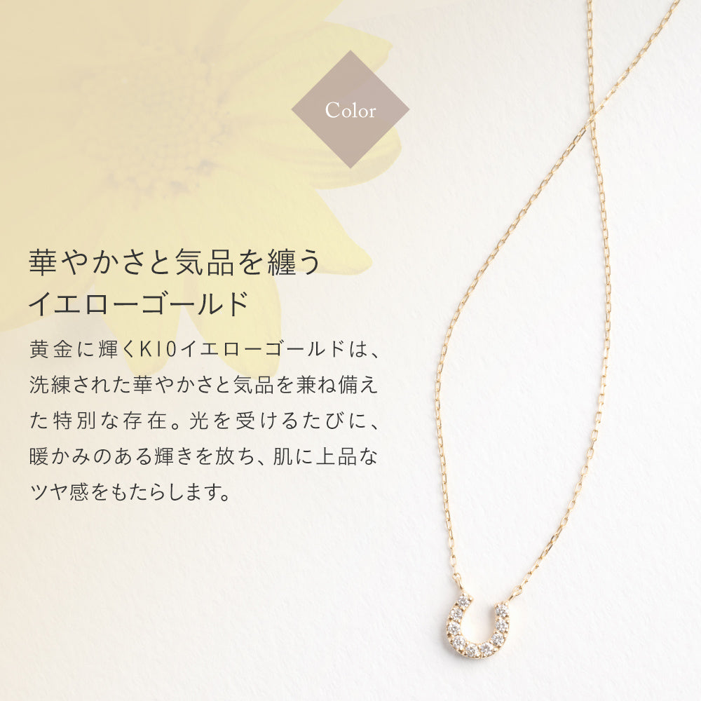 幸運を呼び込むモチーフとして愛されるホースシュー(馬蹄)を、温かみのあるK10イエローゴールドで贅沢に仕立てたネックレス。