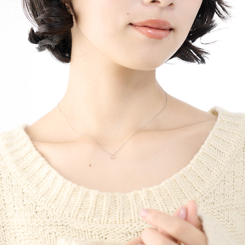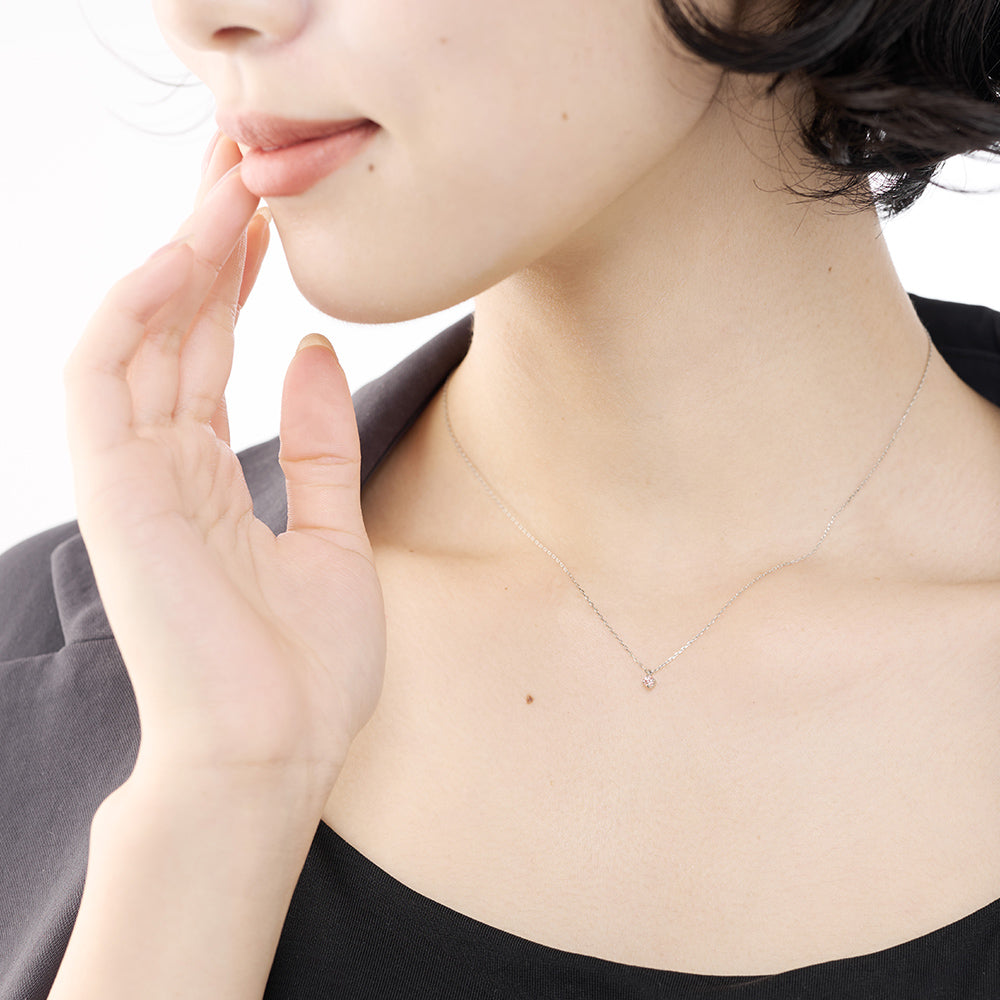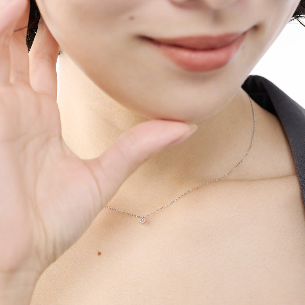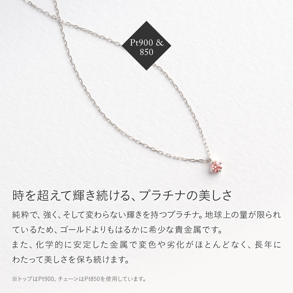 プラチナのチェーンは肌なじみがよく、軽くて着け心地抜群です。ピンクダイヤがさりげなく輝き、女性らしさを引き立ててくれます。